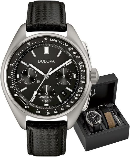 Bulova Reloj de Cuarzo Lunar Pilot de 43,5 mm con cronógrafo, Calendario, Correa de Acero Inoxidable y Correa Adicional Intercambiable de Cuero Negro
