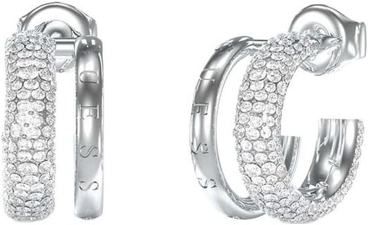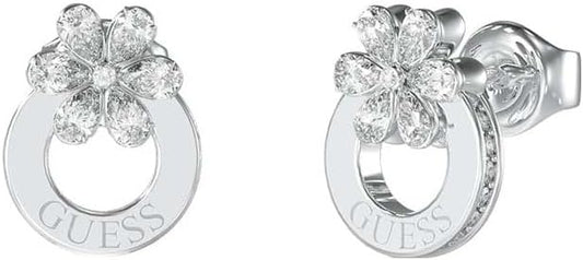 Guess Pendientes Lily Plateados – Argollas de Acero con Flor de Lirio en Cristales Blancos