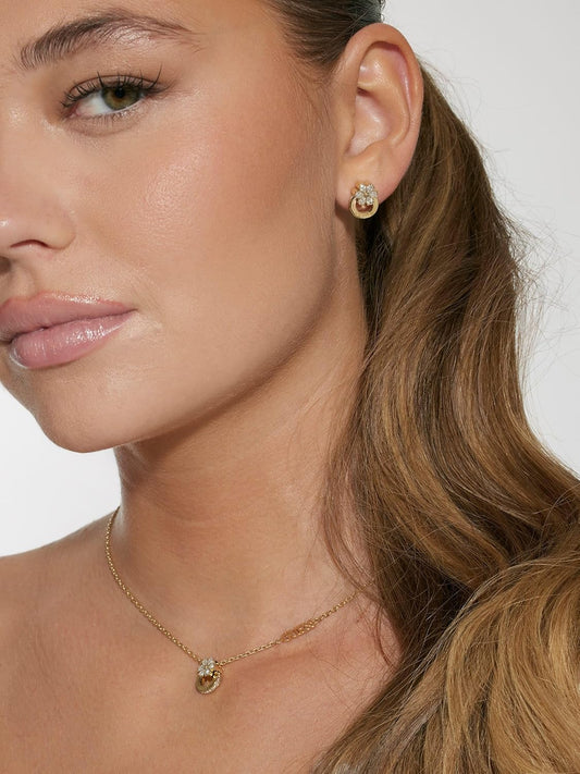 Guess Pendientes Lily Dorados – Argollas de Acero con Flor de Lirio en Cristales Blancos