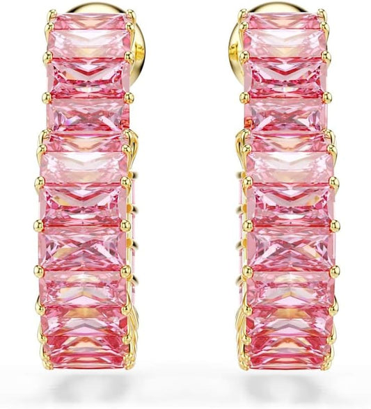 Swarovski Pendientes de aro Matrix, Talla baguette, Corazón, Pequeños, Rosas, Baño tono oro