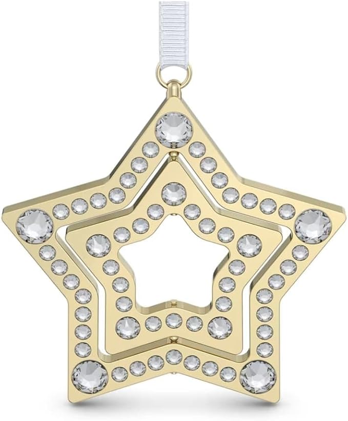 Dale un toque de magia resplandeciente a tu decoración navideña con este radiante adorno de estrella. Inspirado en la familia Stella, este diseño en tono dorado champán está adornado con un pavé de 120 cristales en ambos lados. La magia continúa con un mecanismo giratorio de 360° que permite que la estrella central gire, animando el adorno en una magnífica forma 3D. Esta estrella que cuelga de una cinta de grosgrain blanca es perfecta para hacer que tu hogar brille. Artículo decorativo. No es un juguete. No apto para niños menores de 15 años. Material: metal, cinta de raso. Revestimiento: capa de aleación de oro. Superficie: pulida. Color: dorado, blanco. Engaste de las piedras: cristales de Swarovski. Altura: aprox. 6,9 cm. Ancho: aprox. 6,6 cm. Grosor: aprox. 0,8 cm. Diseñador: Michele Blasilli