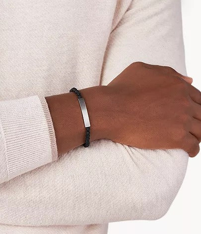 Esta pulsera incluye una placa de acero inoxidable, piedras de lava, correa de poliéster negro y cierre deslizante.