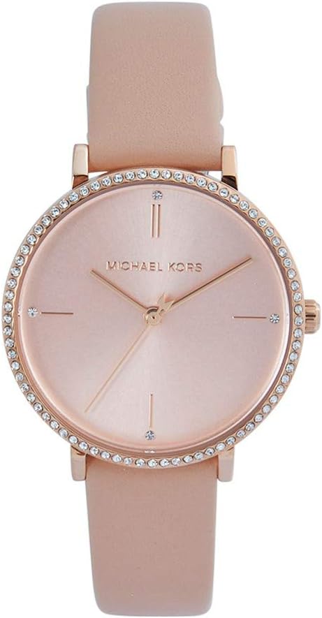 Este elegante reloj de mujer de Michael Kors combina estilo y sofisticación. Su caja de aleación de oro rosa de 32 mm de diámetro está adornada con brillantes circonitas, creando un toque de lujo. La esfera de oro rosa con índices discretos y manecillas delicadas le da un aspecto refinado. La correa de cuero rosa de 14 mm de ancho proporciona comodidad y elegancia. Este reloj de cuarzo de tres manecillas de la colección Jayne es perfecto para ocasiones especiales o para uso diario. Su diseño atemporal lo convierte en un accesorio versátil que se adapta a cualquier estilo.