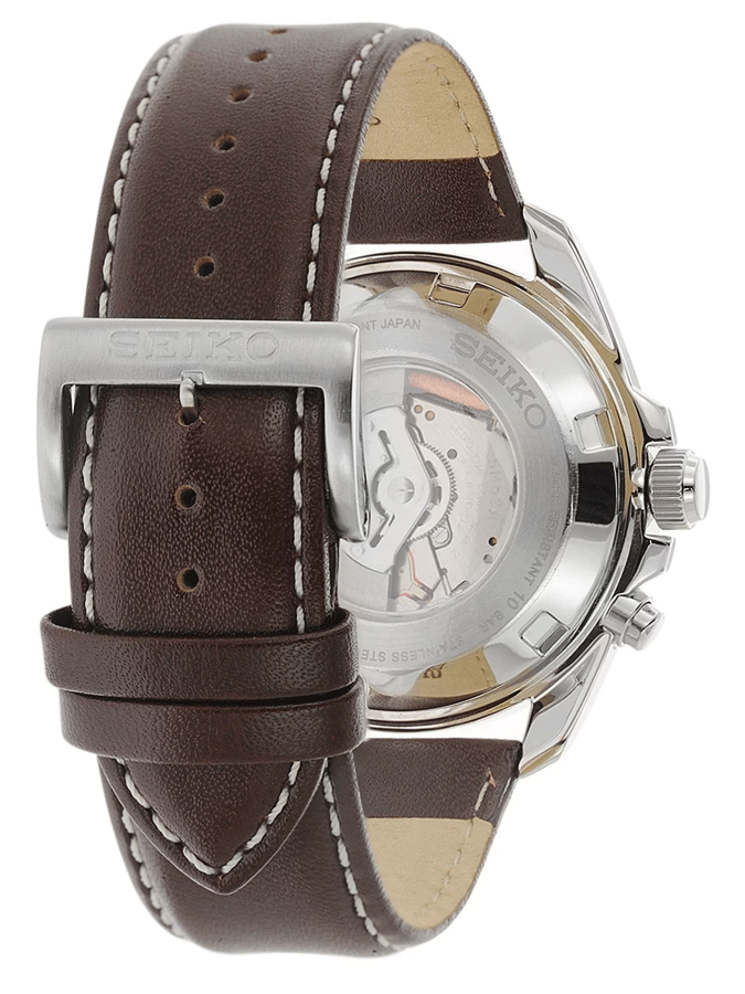 Este reloj marca Seiko tiene una caja de Inox con un diámetro de 42.6 mm y cuenta con una correa de piel. Dentro de la caja se encuentra un mecanismo de Seiko de alta calidad el cual esta protegido por un cristal Cristal hardlex.