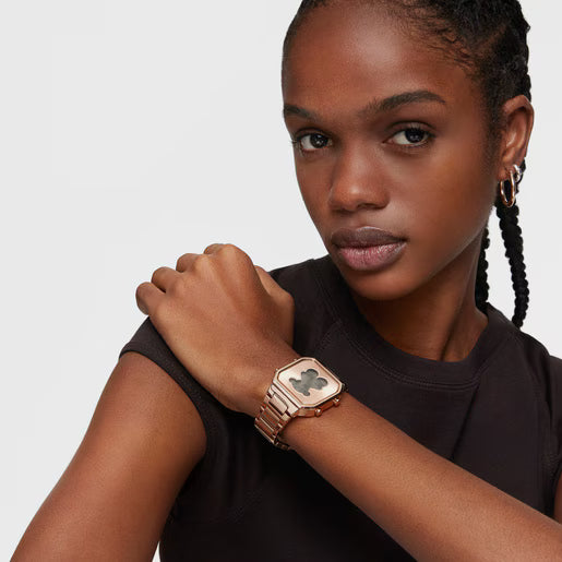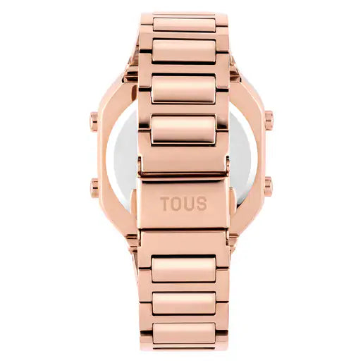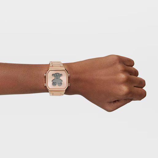 Reloj digital D-BEAR con brazalete de acero IPRG rosado y caja de acero en color IPRG rosado. Diámetro caja: 36,5 x 44,8mm. Esfera: metálica / Pantalla cristal líquido (LCD) con luz. Funciones: hora en 12 o 24 horas, minutos, segundos, día, mes y día de la semana, cronógrafo 1/100 segundos y alarma. Impermeable a 3 ATM. Batería: 3V litio CR2025 / 2,5 gramos (litio 0,003 gramos). Cristal: plano cuadrado con forma de oso en el interior. Cierre desplegable con pulsadores.