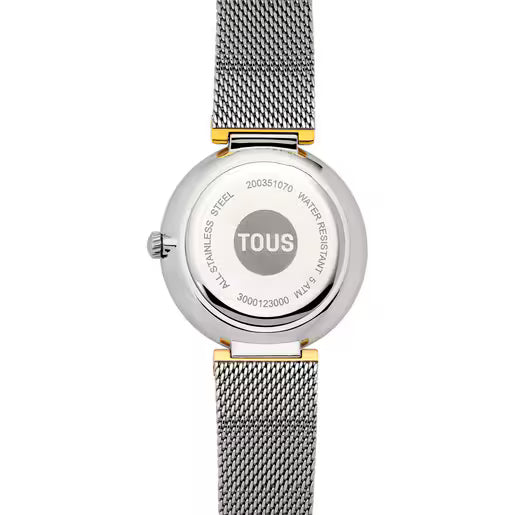 Reloj analógico TOUS S-Mesh Mirror con brazalete de acero inoxidable y esfera en acero IPG dorado. Esfera metal latón con efecto espejo. Dimensiones caja: 36mm. Funciones: hora, minutos y segundos. Impermeable a 5 ATM. Batería: 1,55V Oxido de plata SR621SW / 0,25 gramos. Cristal: mineral facetado plano redondo. Movimiento analógico de cuarzo japonés. Cierre de malla milanesa con cierre de seguridad.