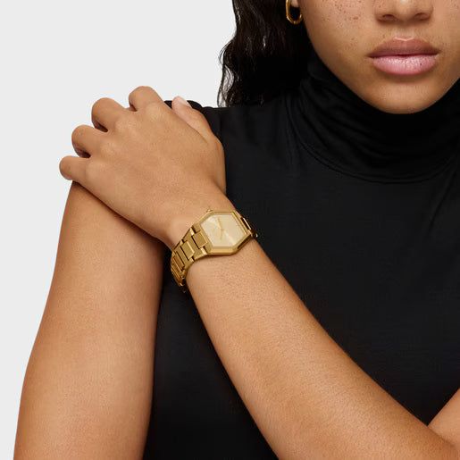 Toda la familia Karat está inspirada en las tallas de las gemas preciosas.; vínculo entre el heritage relojero y la esencia joyera de la marca. El brazalete se encuentran perfectamente integrado a modo de pulsera con eslabones trabajados y facetados ofreciendo un brillo que da carácter a esta colección