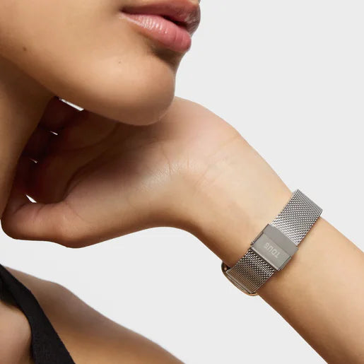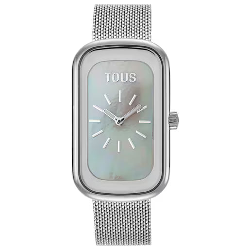 Reloj analógico TOUS T-Band Club con brazalete y caja de acero inoxidable. Diámetro caja: 26,5 mm x 44mm. Esfera: nácar. Funciones: hora y minutos. Impermeable: 3 ATM. Brazalete: 16mm x 16mm x 87mm / 16mm x 16mm x 110mm. Cierre ajustable con cierre de seguridad.