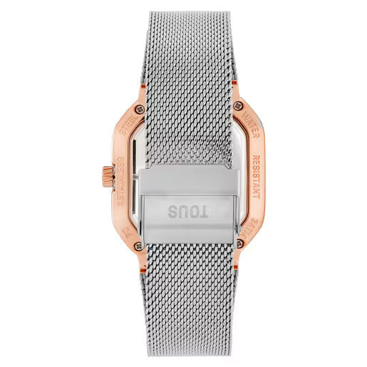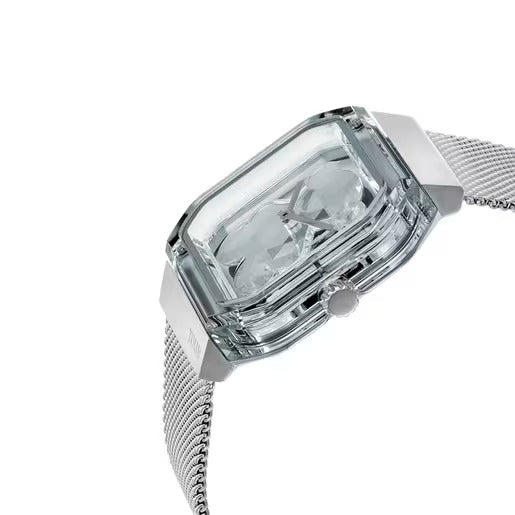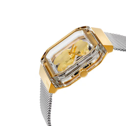 Reloj analógico TOUS D-Bear Party con brazalete de acero inoxidable y caja transparente.