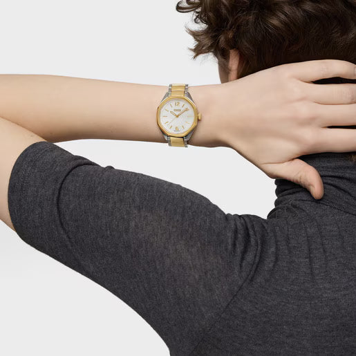 Reloj analógico TOUS Now Lady con brazalete de acero inoxidable y acero dorado. Diámetro: 34,5mm. Esfera: de nacar. Movimiento: analógico de cuarzo suizo. Cristal: zafiro redondo plano con recubrimiento antirreflejo. Centros de ejes: 5 rubies sintéticos. Funciones: hora, minutos y segundos. Impermeable a 10 ATM. Brazalete: 16mm x 16mm x 82mm. Cierre de mariposa con pulsadores.
