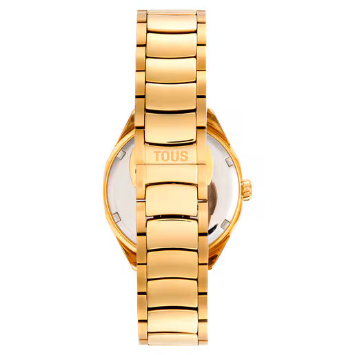 Reloj analógico TOUS Now Lady con brazalete de acero dorado. Diámetro: 34,5mm. Esfera: de nácar. Movimiento: analógico de cuarzo suizo. Cristal: zafiro redondo plano con recubrimiento antirreflejo. Centros de ejes: 5 rubies sintéticos. Funciones: hora, minutos y segundos. Impermeable a 10 ATM. Brazalete: 16mm x 16mm x 82mm. Cierre de mariposa con pulsadores.