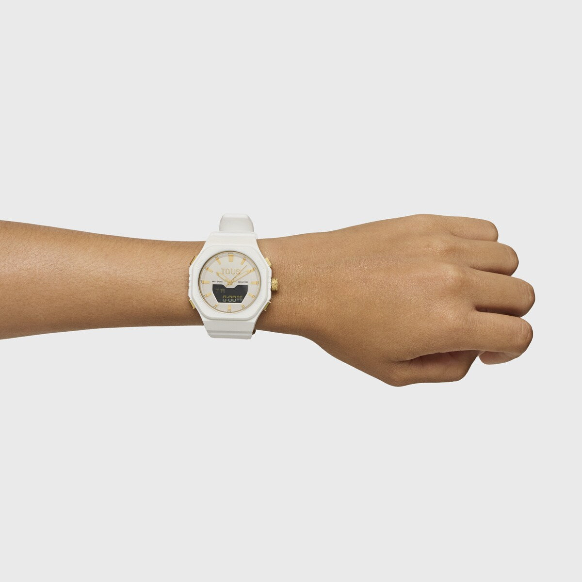 Bet es una apuesta por lo rápido que te enamorarás de este reloj. Un movimiento analógico convive con un módulo digital en una estructura robusta de Nylon endurecido y con 10 ATM. “Sporty Chic”