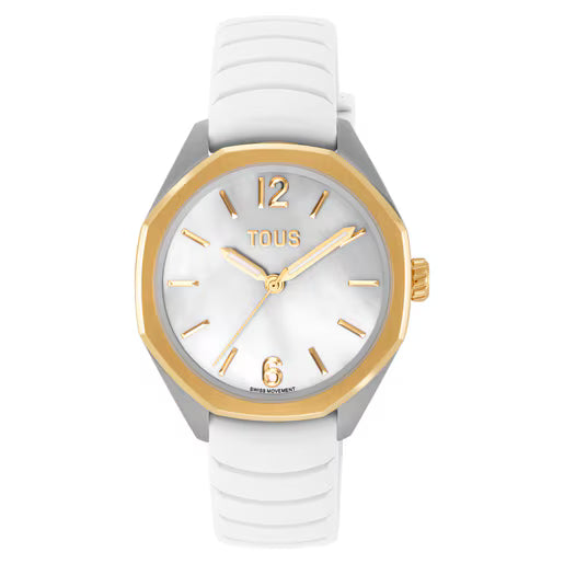 Reloj analógico TOUS Now Lady con correa de caucho en color blanco. Diámetro: 34,5 mm. Esfera: de nacar. Movimiento: analógico de cuarzo suizo. Cristal: zafiro redondo plano con recubrimiento antirreflejo. Funciones: hora, minutos y segundos. Impermeable a 10 ATM. Brazalete: 16mm x 16mm x 70mm / 16mm x 16mm x 110mm. Cierre hebilla.