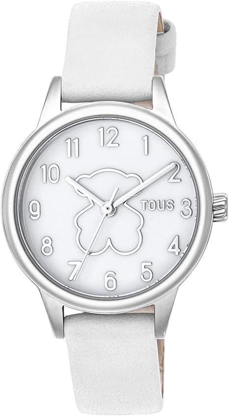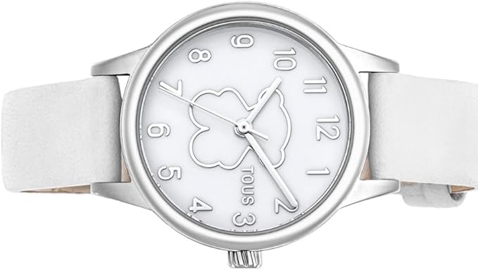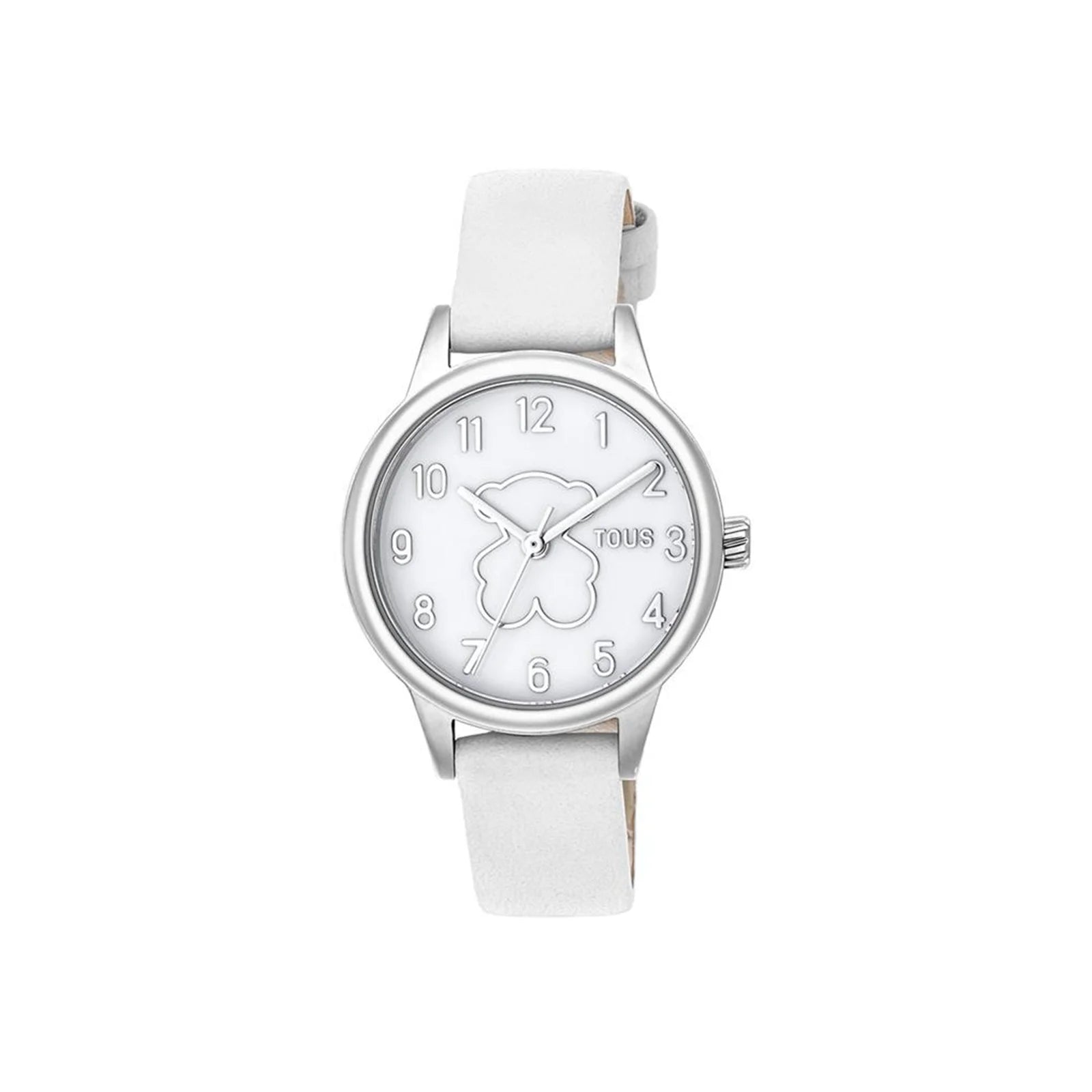 Reloj Tous Watches para niña de la colección New Muffin fabricado en acero inoxidable plateado y piel en color blanco. Estamos ante un reloj de diseño elegante y original compuesto por caja plateada de 28mm de diámetro con esfera blanca que contiene índices y agujas en plateado movidas por mecanismo de cuarzo analógico protegido por cristal mineral. Su correa es de piel en color blanco con cierrede hebilla. Resistente al agua hasta 50 metros.