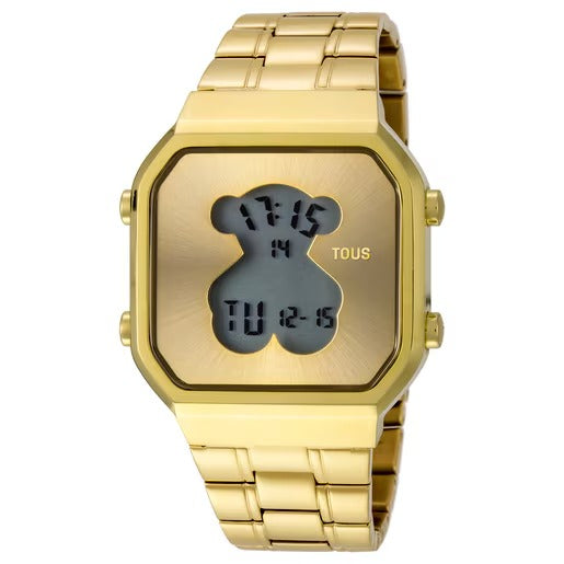 Reloj de mujer Tous D-Bear realizado en acero inoxidable dorado con funciones de hora, minuto, segundo, mes, día de la semana, alarma y cronógrafo. La esfera octogonal en color dorado tiene un módulo digital en forma de oso, icono de la firma. Un complemento de lo más elegante y chic para lucir con todos tus looks.