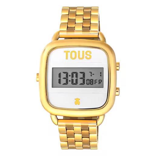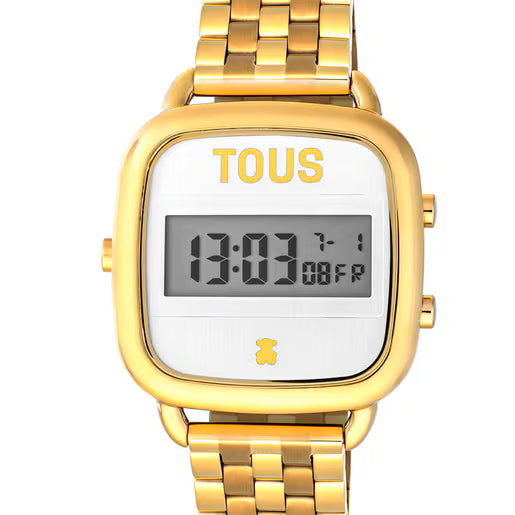 Reloj digital TOUS D-Logo con brazalete de acero IP dorado. Funciones: hora, minutos, segundos, día, mes, día de la semana, cronógrafo 1/100 segundos y alarma. Impermeable a 5 ATM.