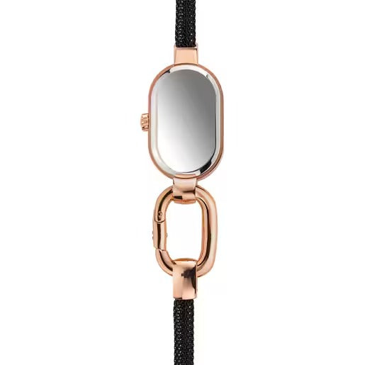 Reloj analógico TOUS Hold Oval con brazalete malla de acero IP negro y caja de acero IPRG rosado. Esfera metal de latón en color negro. Dimensiones: 18 mm x 28,5 mm. Funciones: hora y minutos. Impermeable a 3 ATM. Batería: 1,55V Oxido de plata SR521SW/0,2 gramos. Cristal mineral plano ovalado. Movimiento analógico de cuarzo japonés. Cierre de joyería.