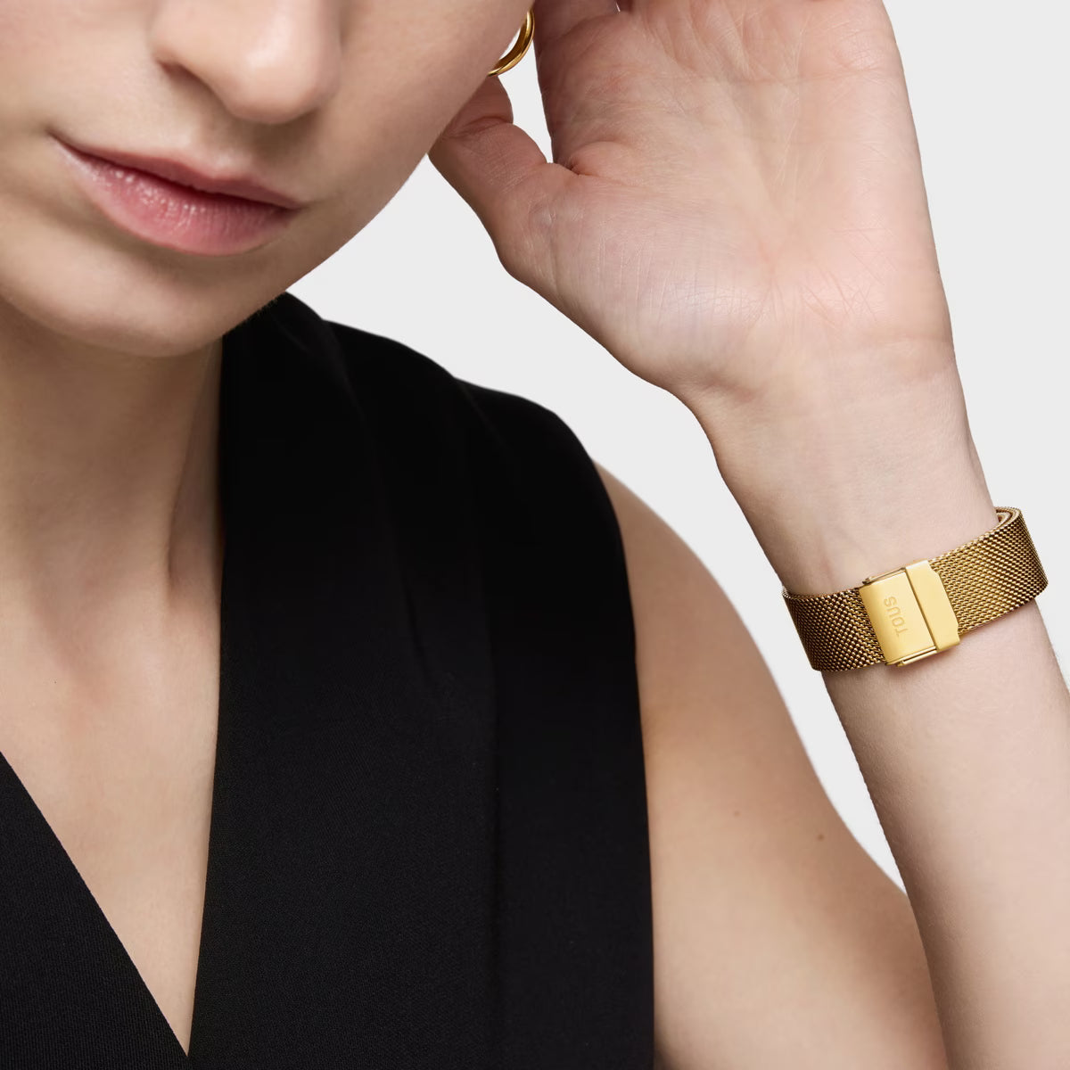 Reloj analógico TOUS S-Mesh Mirror con brazalete y caja de acero dorado. Diámetro caja: 36 mm. Esfera: con efecto espejo en color verde. Funciones: hora, minutos y segundos. Movimiento: analógico de cuarzo japonés. Impermeable: 5 ATM. Brazalete: 65mm x 18mm x 16mm / 105mm x 18mm x 16mm. Cierre de malla milanesa con cierre de seguridad.