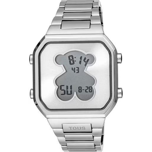 Reloj digital D-BEAR con brazalete de acero inoxidable y caja de acero inoxidable. Diámetro caja: 36,5 x 44,8mm. Esfera: metálica / Pantalla cristal líquido (LCD) con luz. Funciones: hora en 12 o 24 horas, minutos, segundos, día, mes y día de la semana, cronógrafo 1/100 segundos y alarma. Impermeable a 3 ATM. Batería: 3V litio CR2025 / 2,5 gramos (litio 0,003 gramos). Cristal: plano cuadrado con forma de oso en el interior. Cierre desplegable con pulsadores.