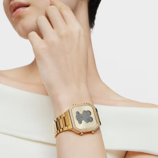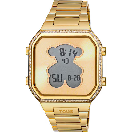 Reloj digital D-BEAR con brazalete de acero IPG dorado y bisel con 80 zirconitas cubicas CZ engastadas en carril. Diámetro caja: 36,5 x 44,8mm. Funciones: hora, minutos, segundos, día, mes i día de la semana, cronógrafo 1/100 segundos y alarma. Impermeable a 3 ATM. Batería: 3V litio CR2016 / 1,69 gramos (litio 0,025 gramos). Cristal: vidrio endurecido plano con forma de oso. Cierre desplegable con pulsadores.