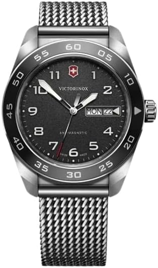 Precisión técnica inquebrantable y estilo versátil: Swiss Army Quartz Leather es la esencia de la confiabilidad. Un reloj de distinguida durabilidad y diseño original, elaborado por expertos para conquistar cualquier aventura. Ponte su fina estética de cuero en la muñeca y explora cualquier paisaje con su actitud innata de “se puede”. Detalles del producto Reseñas y calificación Reloj con protección antimagnética Simplicidad funcional en un reloj. El Swiss Army Quartz es tu aliado en todas las aventuras al aire libre. Pragmático, pero novedoso en su ADN de diseño, se integra a la perfección en cualquier situación con su ingeniería confiable y tecnicidad pionera. La esfera optimizada con numerales con relieve y manecillas grandes SuperLuminova iluminadas aseguran fácil legibilidad las 24 horas. El movimiento de día y fecha de cuarzo analógico Ronda 517 establece un meticuloso estándar para la organización del calendario y la precisión del reloj. Suma su incomparable precisión a tu vida. Swiss Army Quartz - 242043 Dimensiones Altura: 11 mm Peso: 145 g Distancia entre asas: 21 mm Diámetro: 42 mm Detalles N° de artículo: 242043 Pais de origen: Suiza Sellado de tapa de la caja: Tapa de caja atornillada Cronógrafo: No Cierre: Hebilla corrediza Rotación del bisel: Bisel fijo Cuenta atrás: No Fecha: Sí Agujas luminiscentes: Sí Segundo huso horario: No Resistente al agua: 10 ATM/100 M/330 FT Materiales Material de la caja: Acero inoxidable Acabado de la caja: Cepillado Material del bisel: De acero inoxidable Acabado del bisel: Pulido Material interior del maletín: Acero inoxidable Acabado de la esfera: Mate Material del brazalete: Malla Colores Color de la caja: Plata Color del bisel: Plata Color del brazalete: Plata